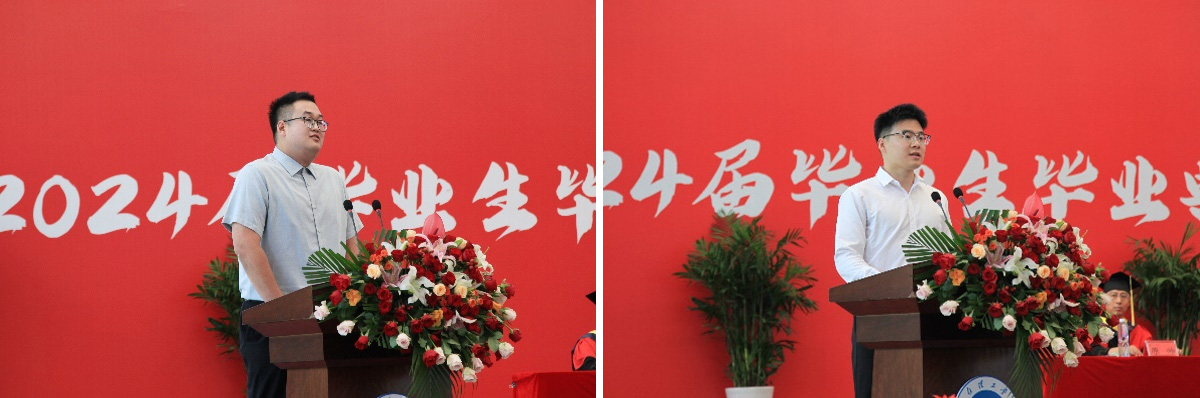 教師代表外國語學院徐家南、畢業生代表人工智能學院丁天舉分別上臺并發言。優秀畢業生代表向老師敬獻鮮花以表師恩難忘。
