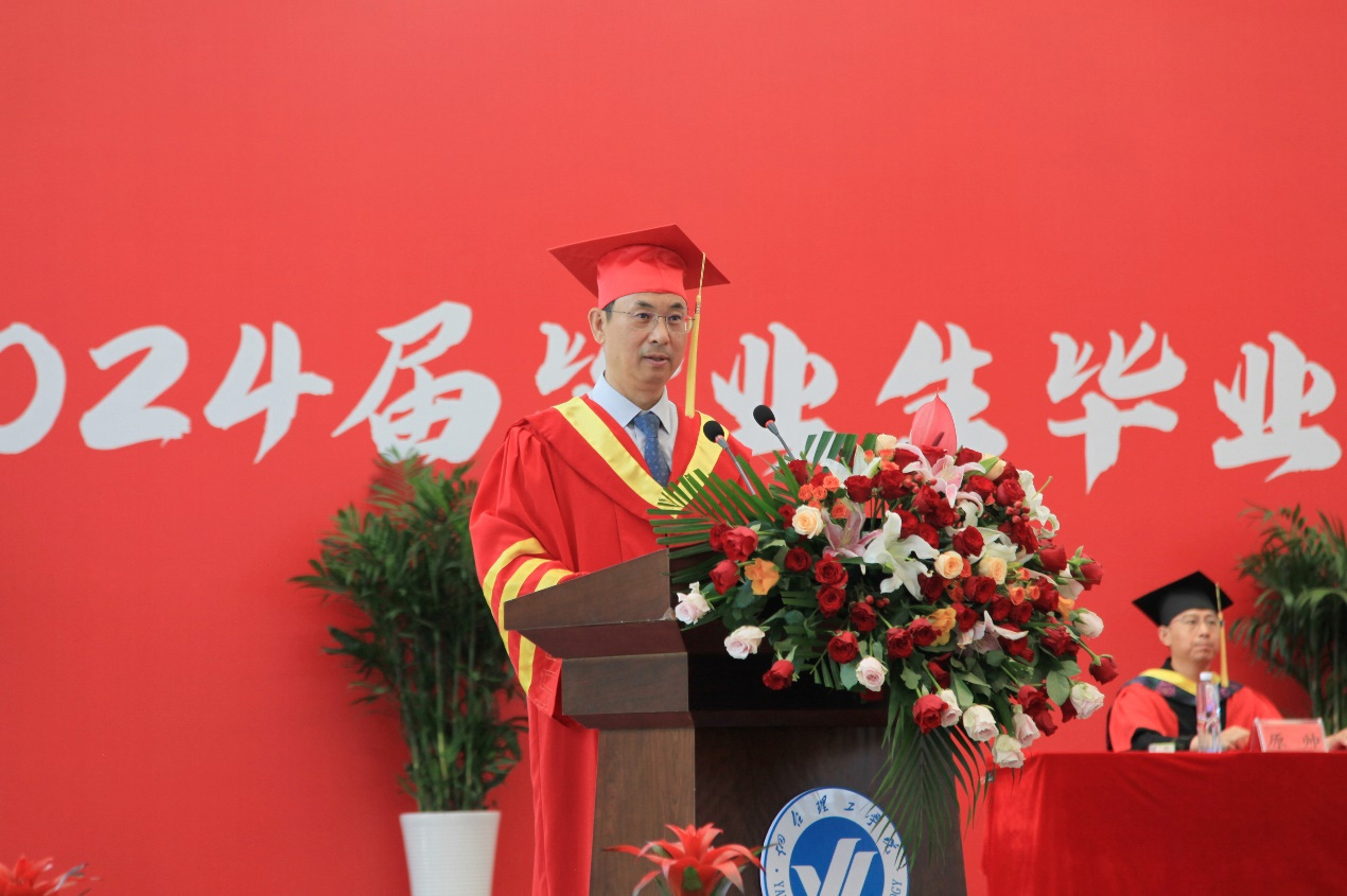 大會最后,煙臺理工學院校長于光輝發表了講話。于校長首先代表學校向圓滿完成學業的畢業生表示衷心祝賀,感謝2024屆本科畢業生在四年的時光中,陪伴煙臺理工學院共同成長進步。期望同學們在未來的生活中秉持“和合”精神,學會溝通合作;永葆熱愛,心懷家國;心懷勇氣,不懈拼搏,奔赴星辰大海。