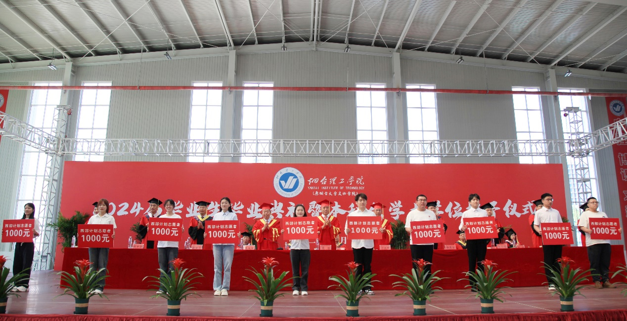 辛軍董事長、于光輝校長、盛國軍書記為優秀畢業生代表、志愿服務西部計劃畢業生頒獎,為畢業生代表頒發學位證書、扶正流蘇并合影留念。